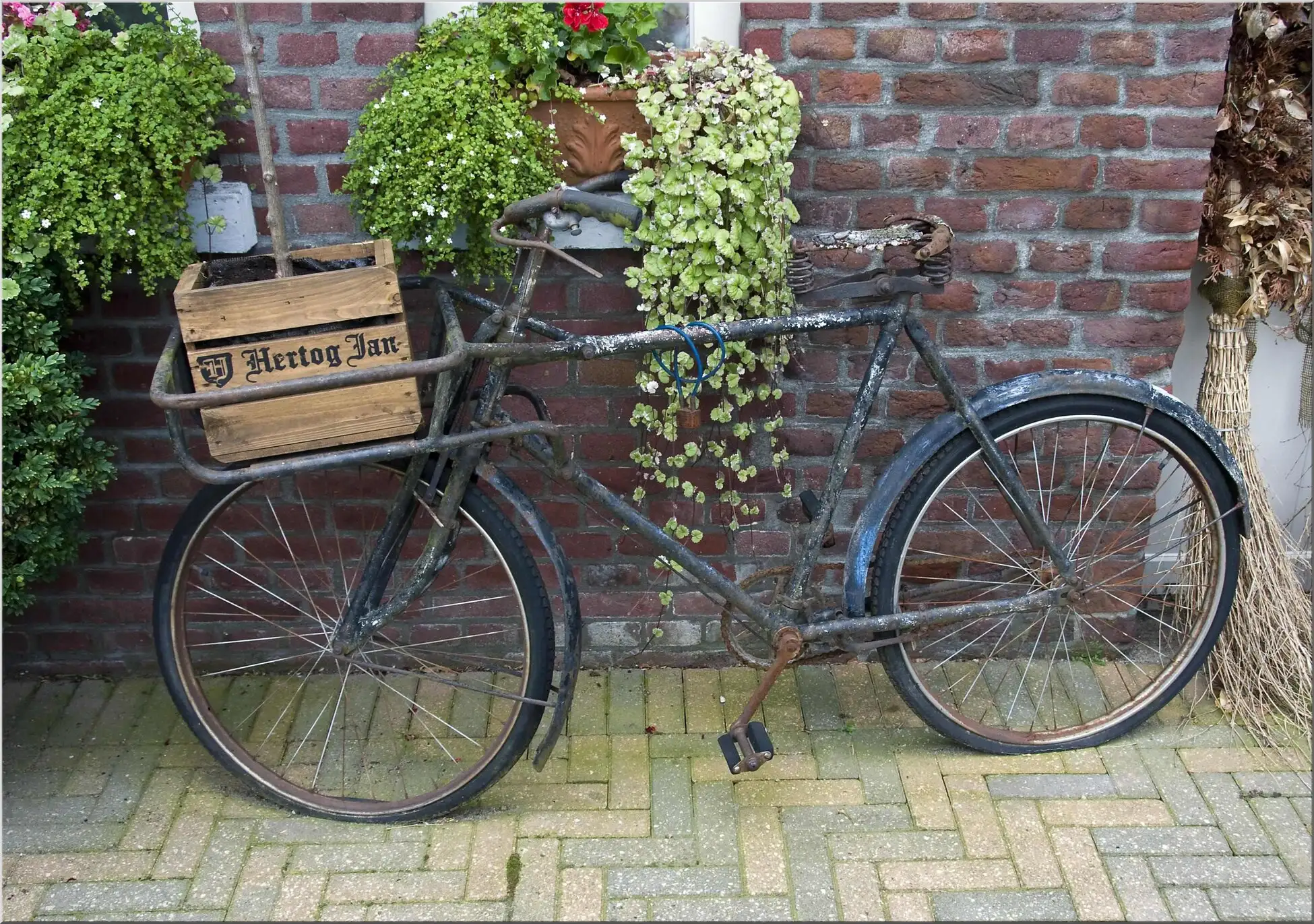 Altes Fahhrrad mit Holzkiste vor einer Hauswand mit Sommerblumen.Schönes altes Fahrrad. Viele kennen das bestimmt schon gar nicht mehr,da das Radfahren mit Ebikes heutzutage leicht und einfach geht.Diese DIN A6 Motiv Postkarte drucken wir exklusiv auf einem350gr Postkartenkarton. Die Rückseite ist mit jedem Stiftgut zu beschreiben.