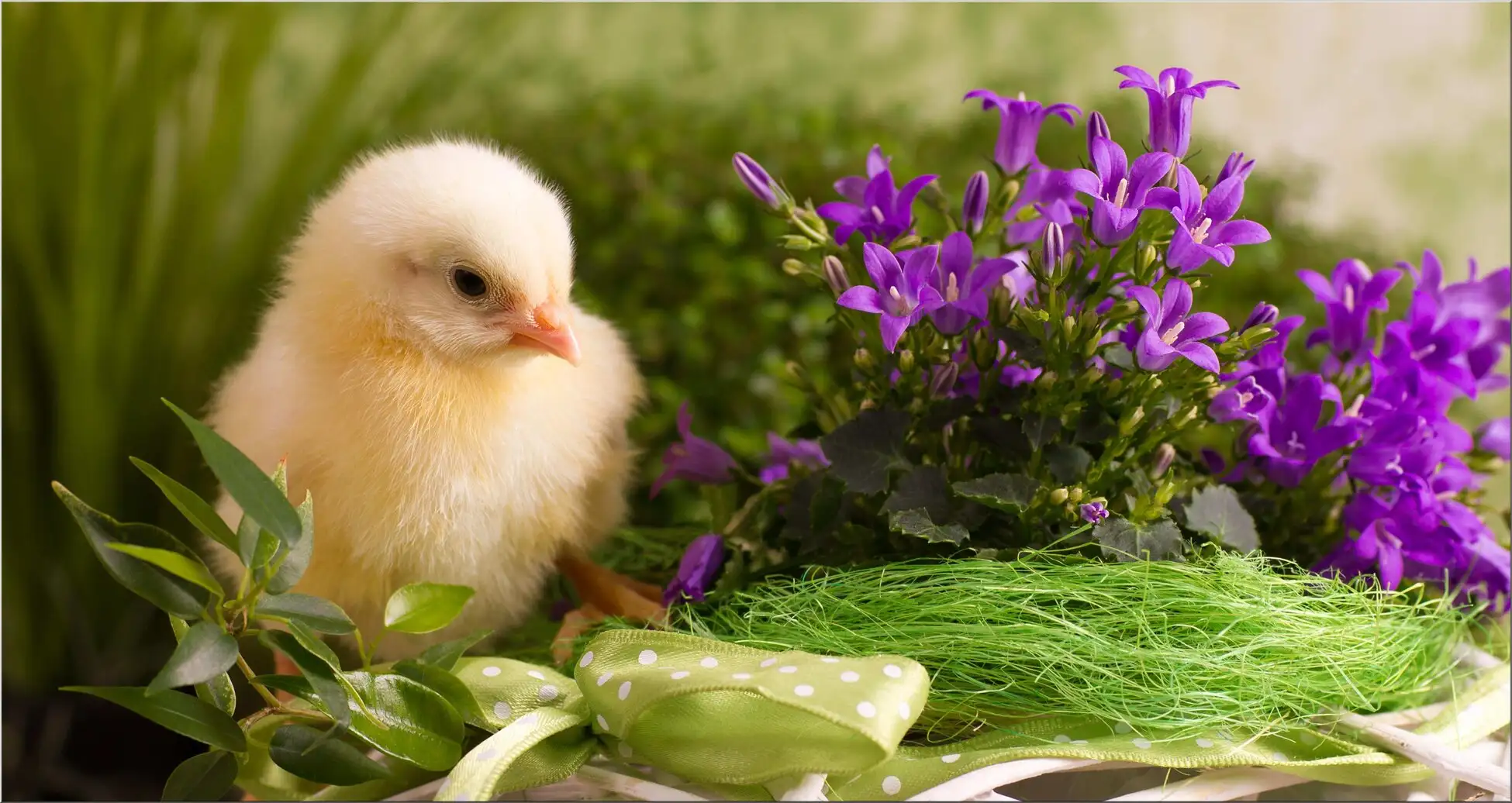 Maxi Osterkarte Küken mit Blumenkorb zu Ostern